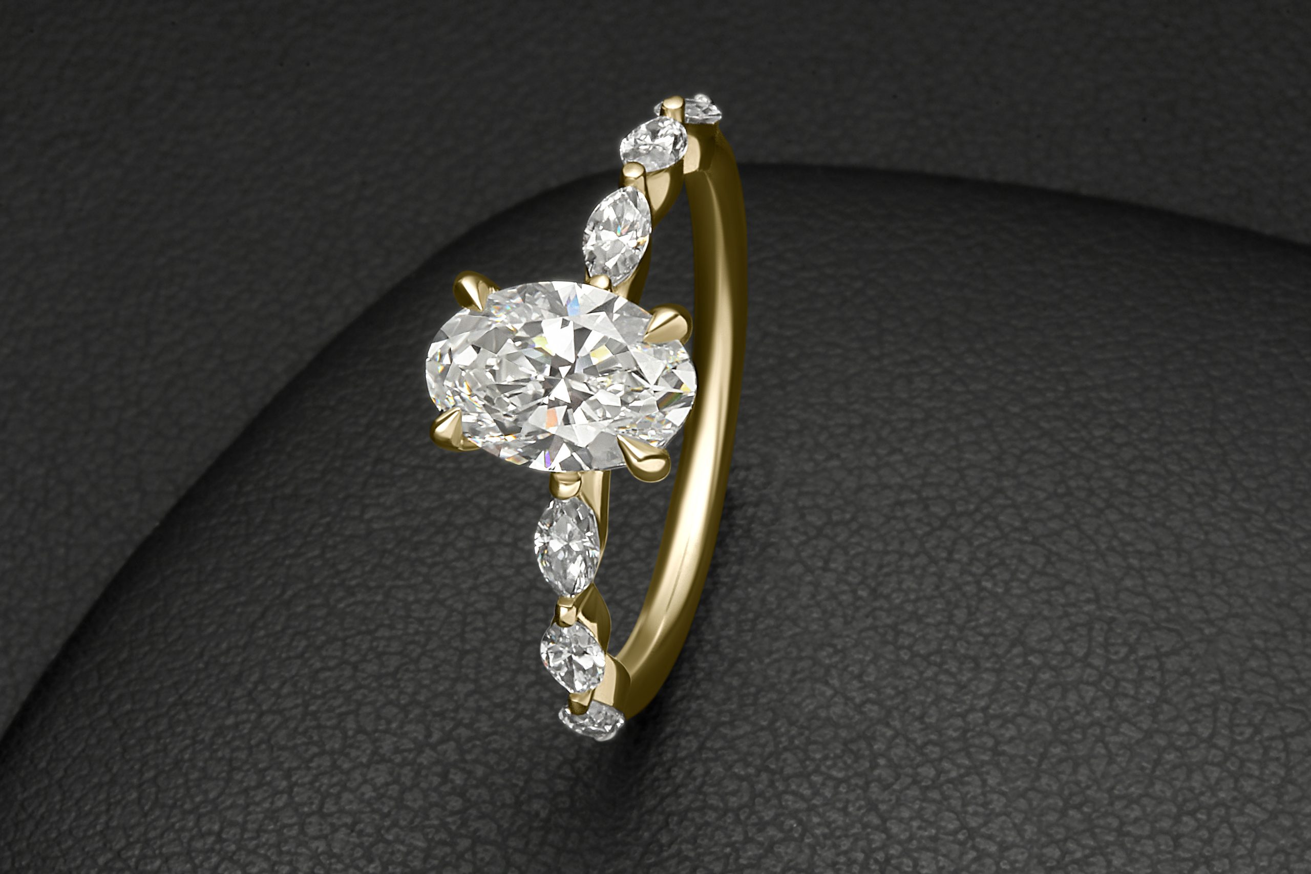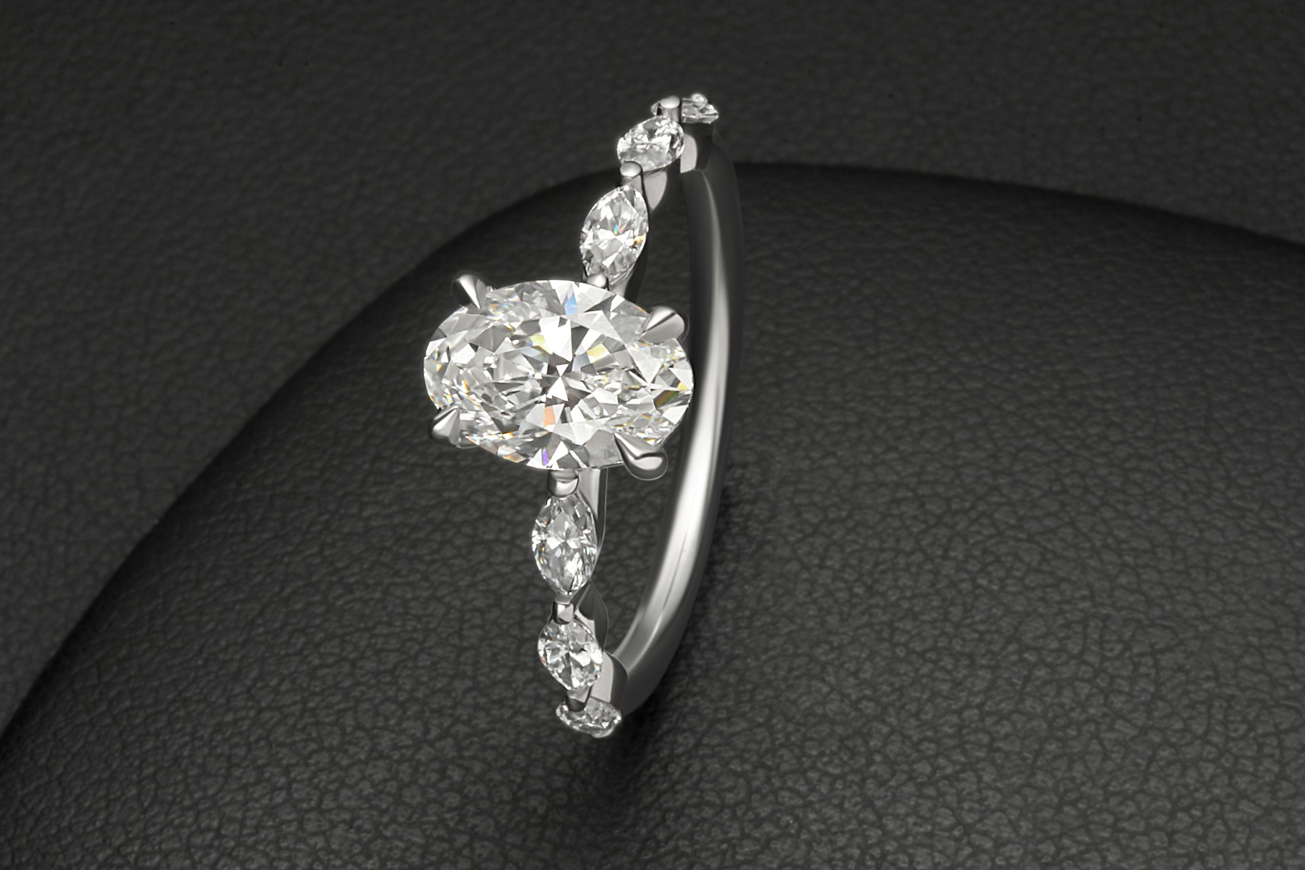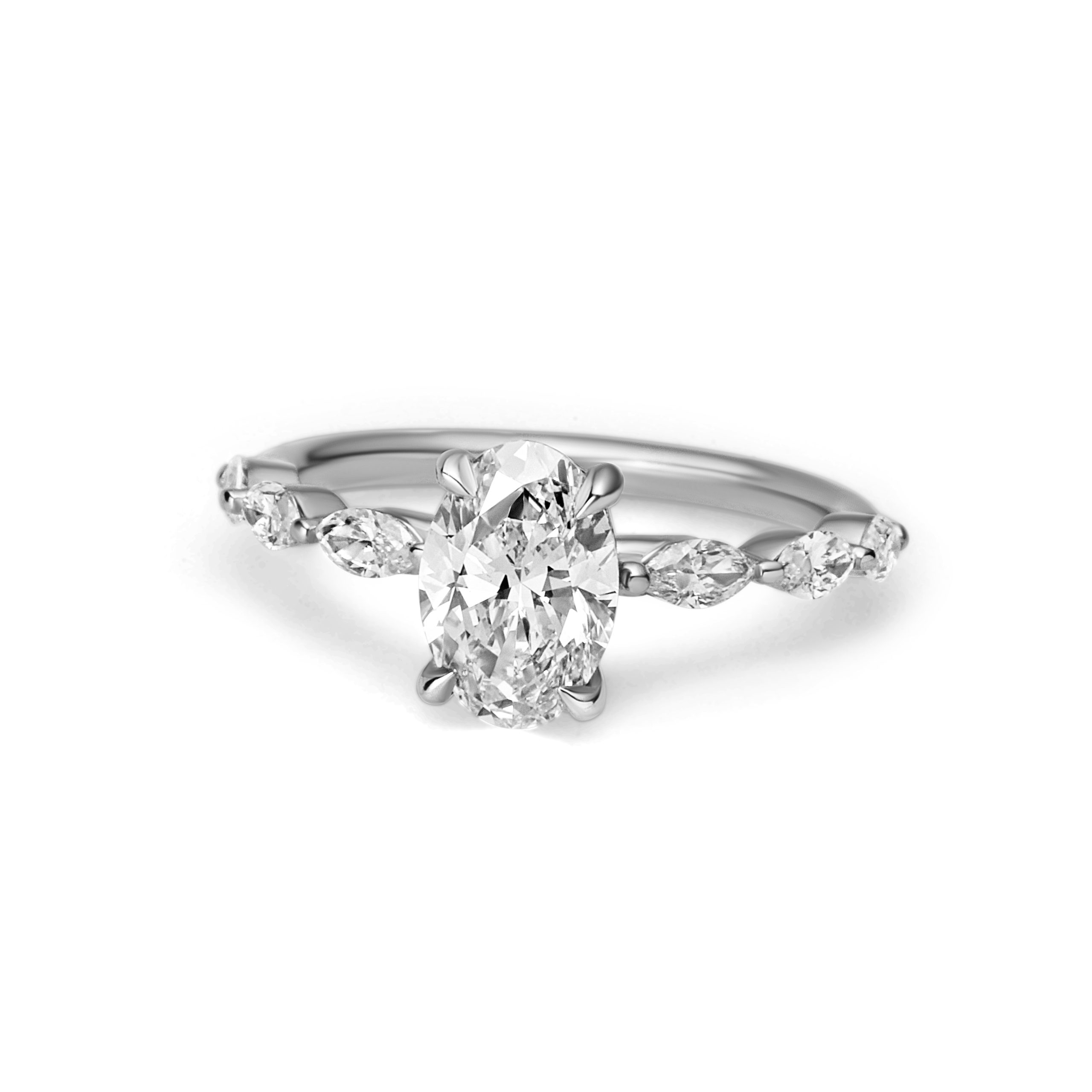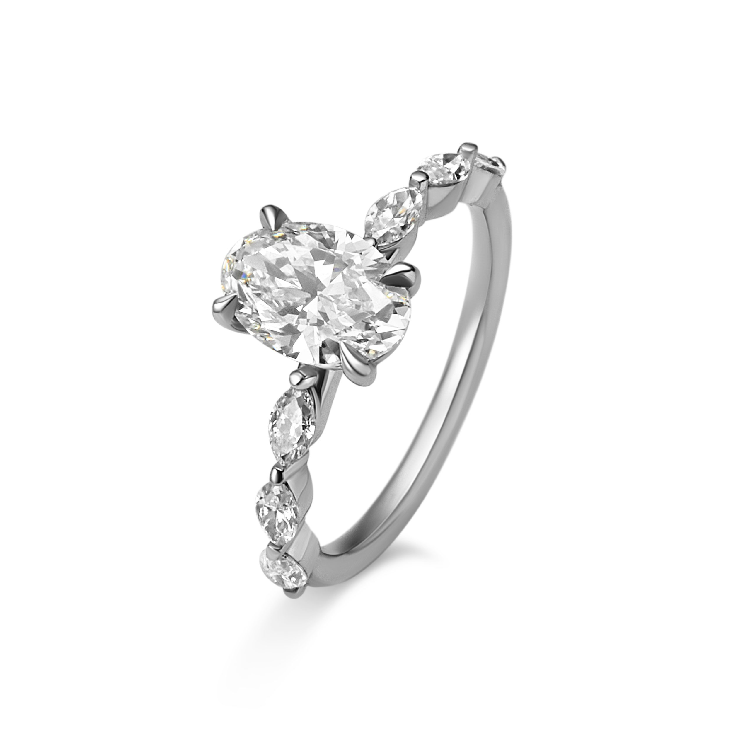 This diamond ring features 1 center stone and 6 side stones. Main diamond is G+ Color and SI+ clarity & side diamonds are D-E color and VVS-VS clarity, carefully selected for brilliance and consistency.