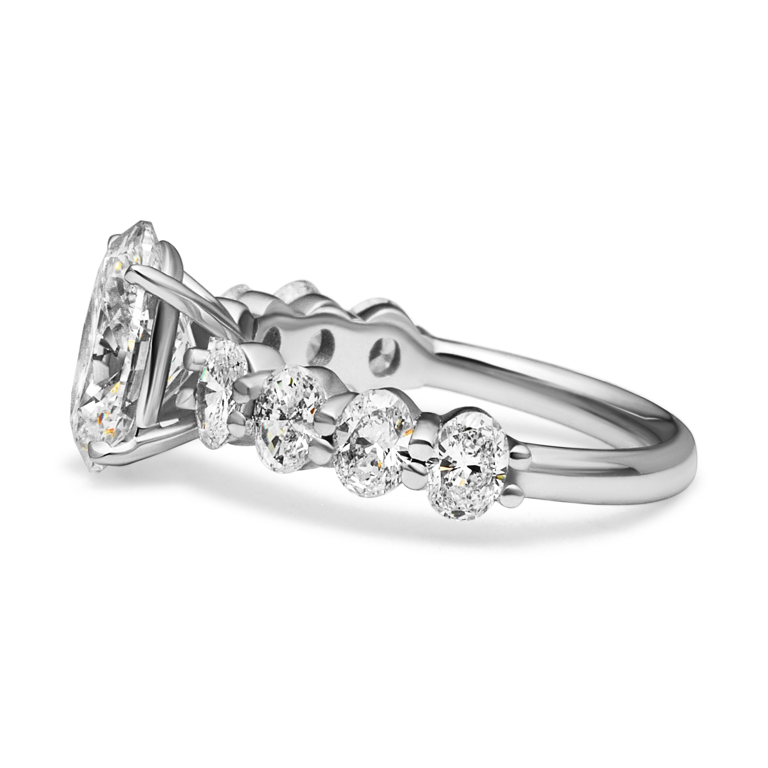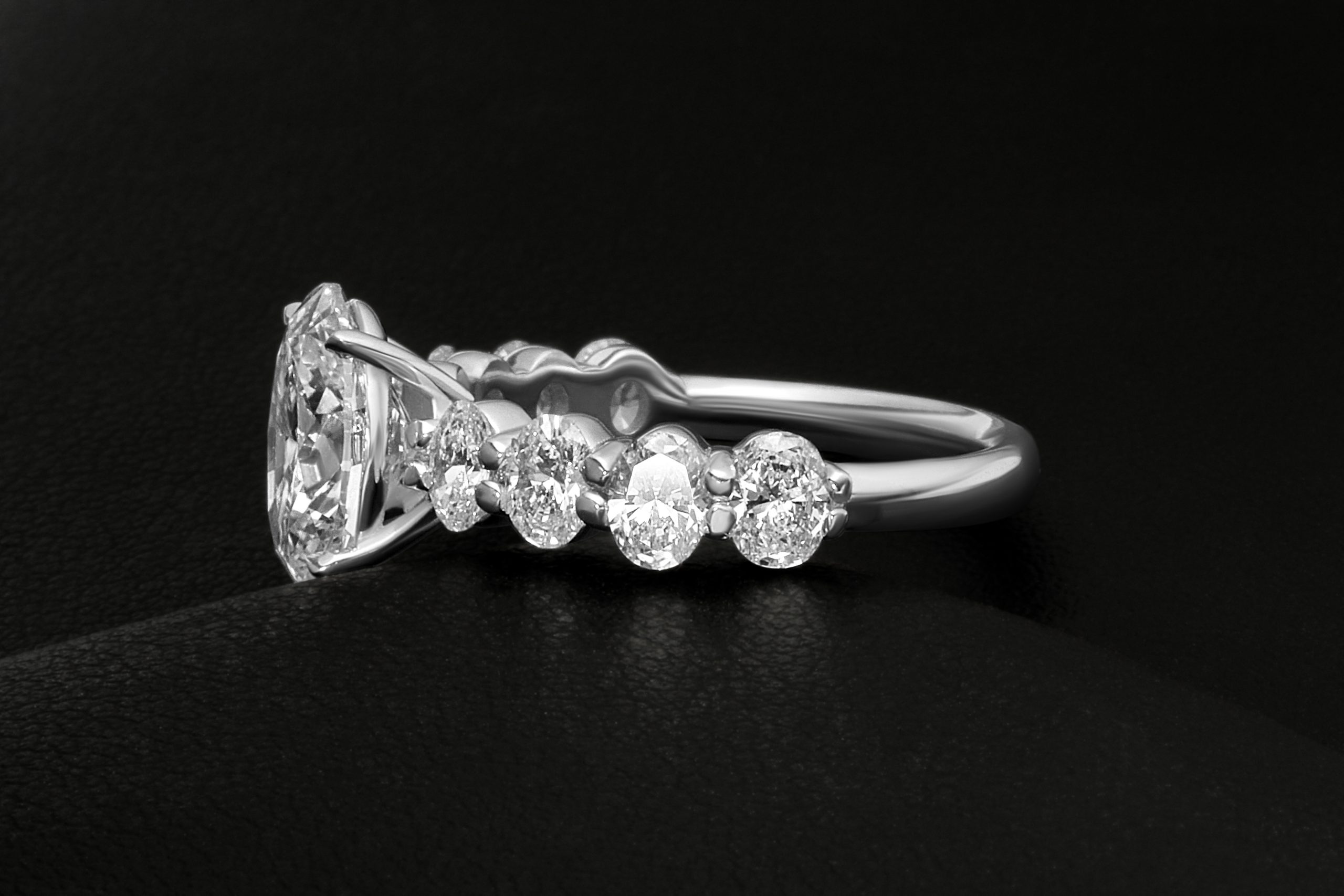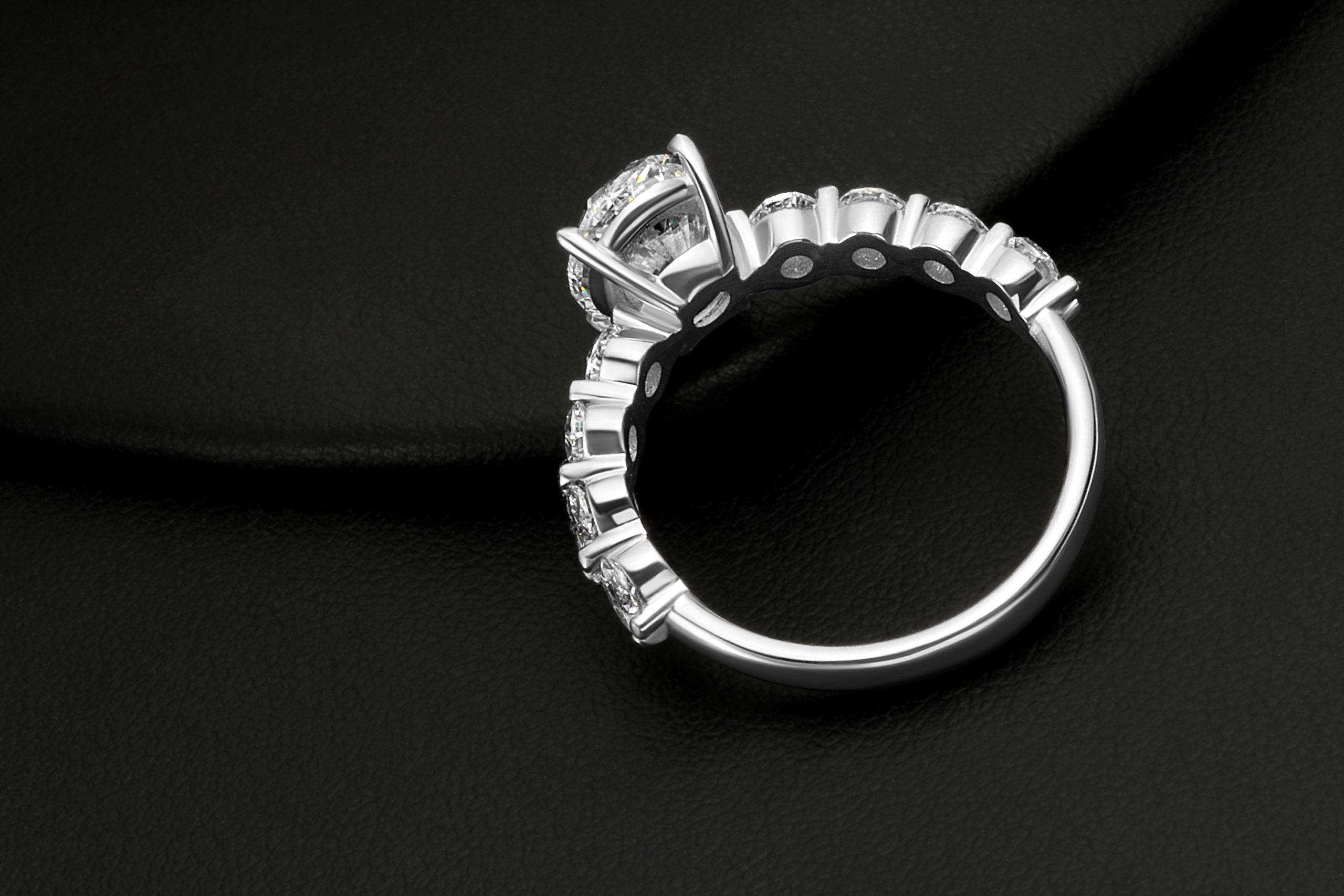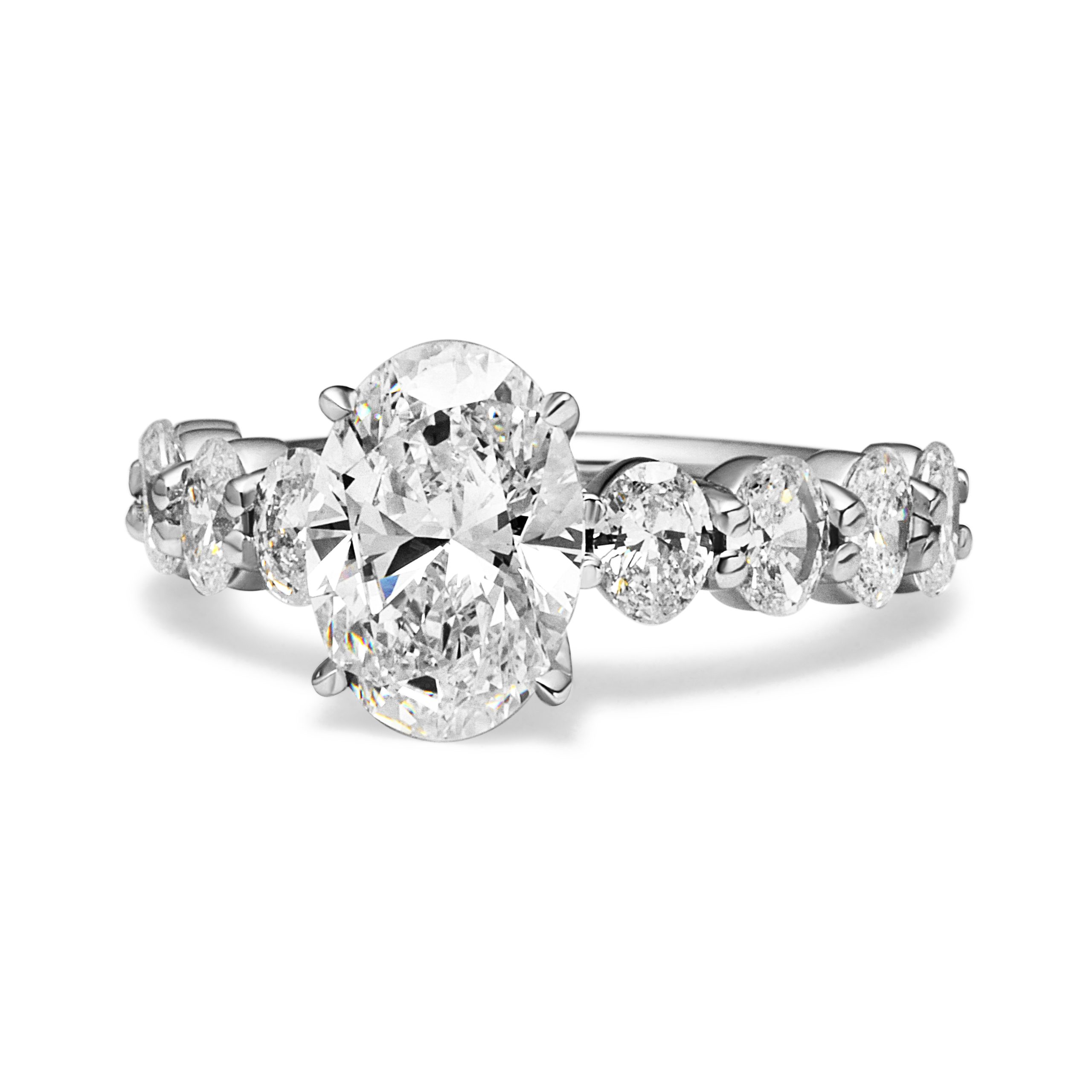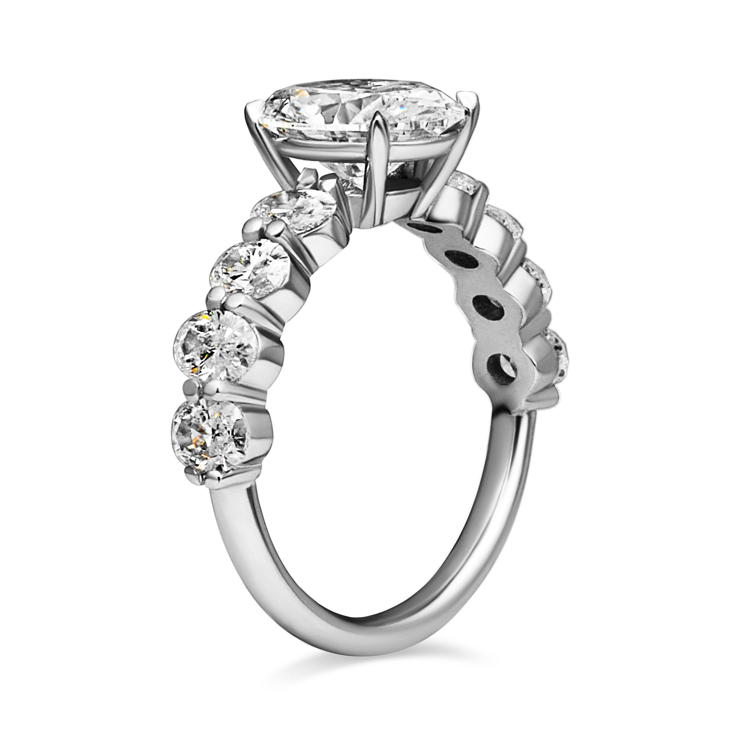 This diamond ring features 1 center stone and 8 side stones. Main diamond is F+ color and SI+ clarity & side diamonds are D-E color and VVS-VS clarity, carefully selected for brilliance and consistency.