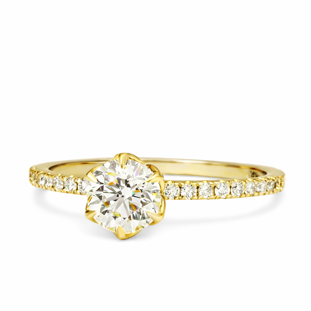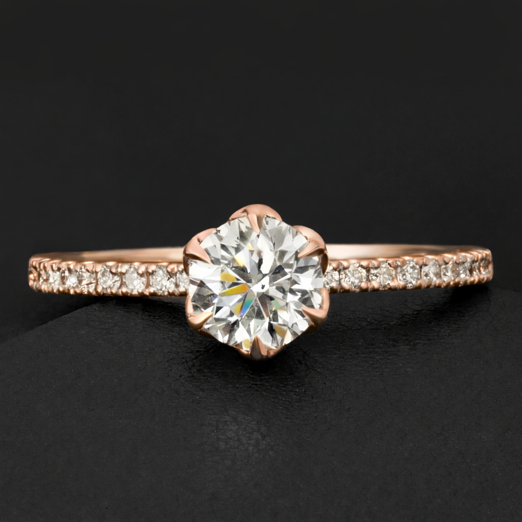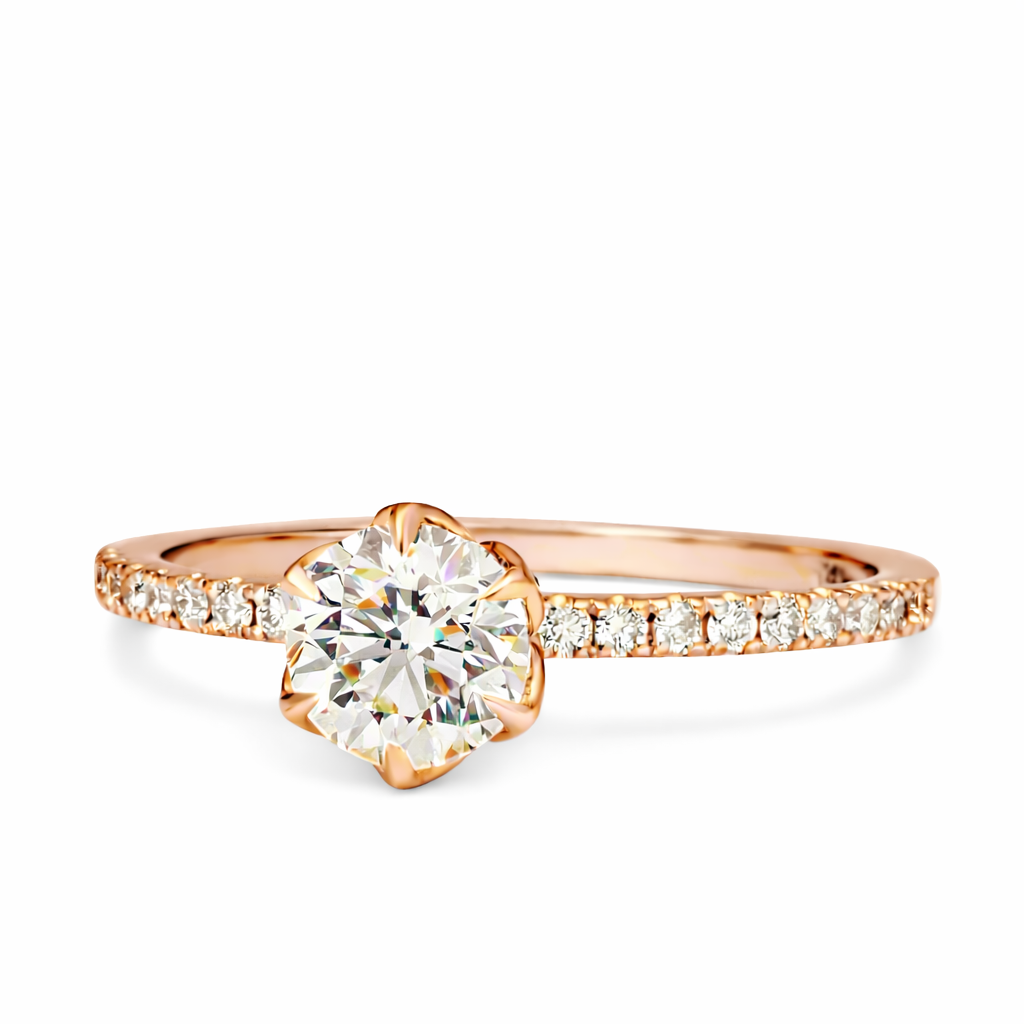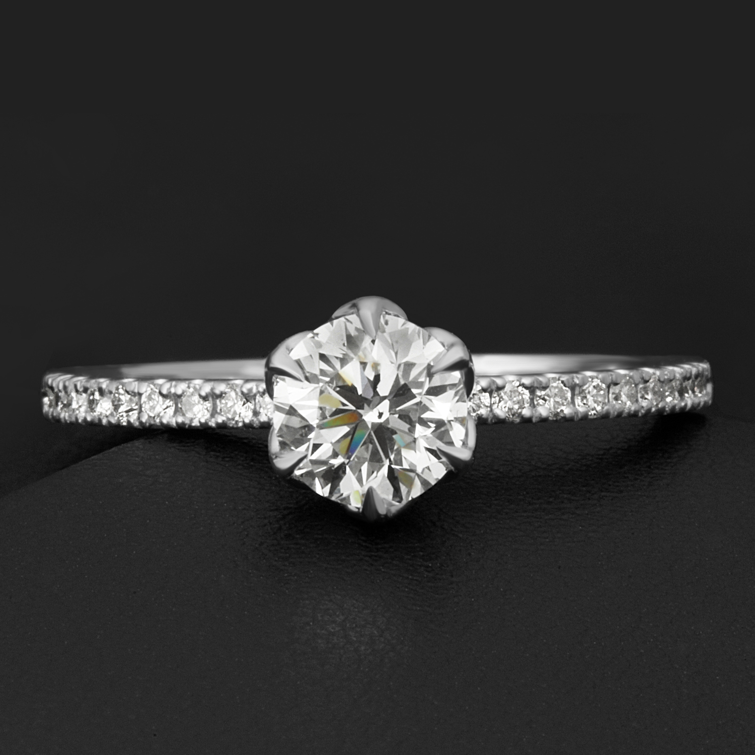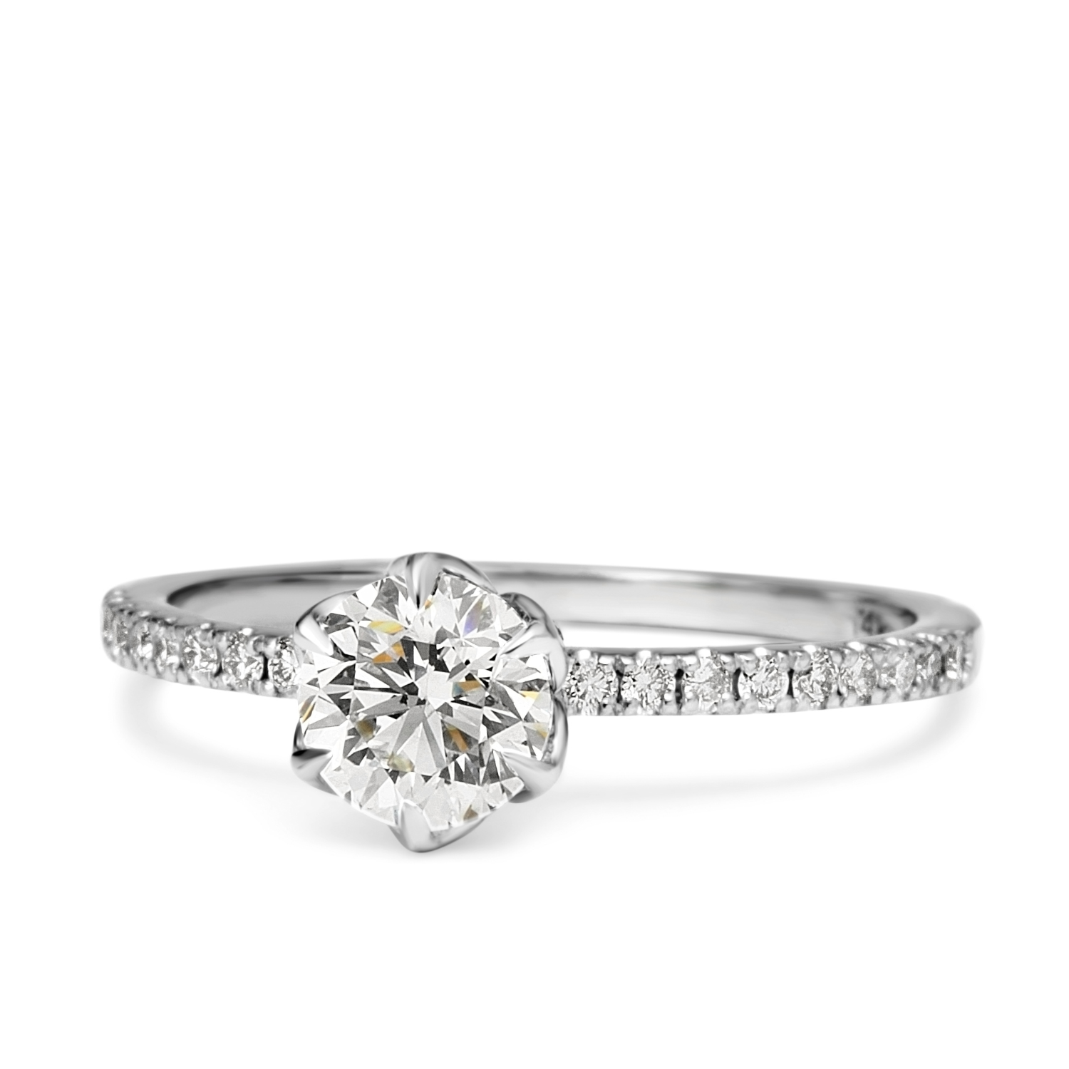 This diamond ring features 1 center stone and 18 side stones. Main diamond is G+ color and SI+ clarity & side diamonds are D-E color and VVS-VS clarity, carefully selected for brilliance and consistency.