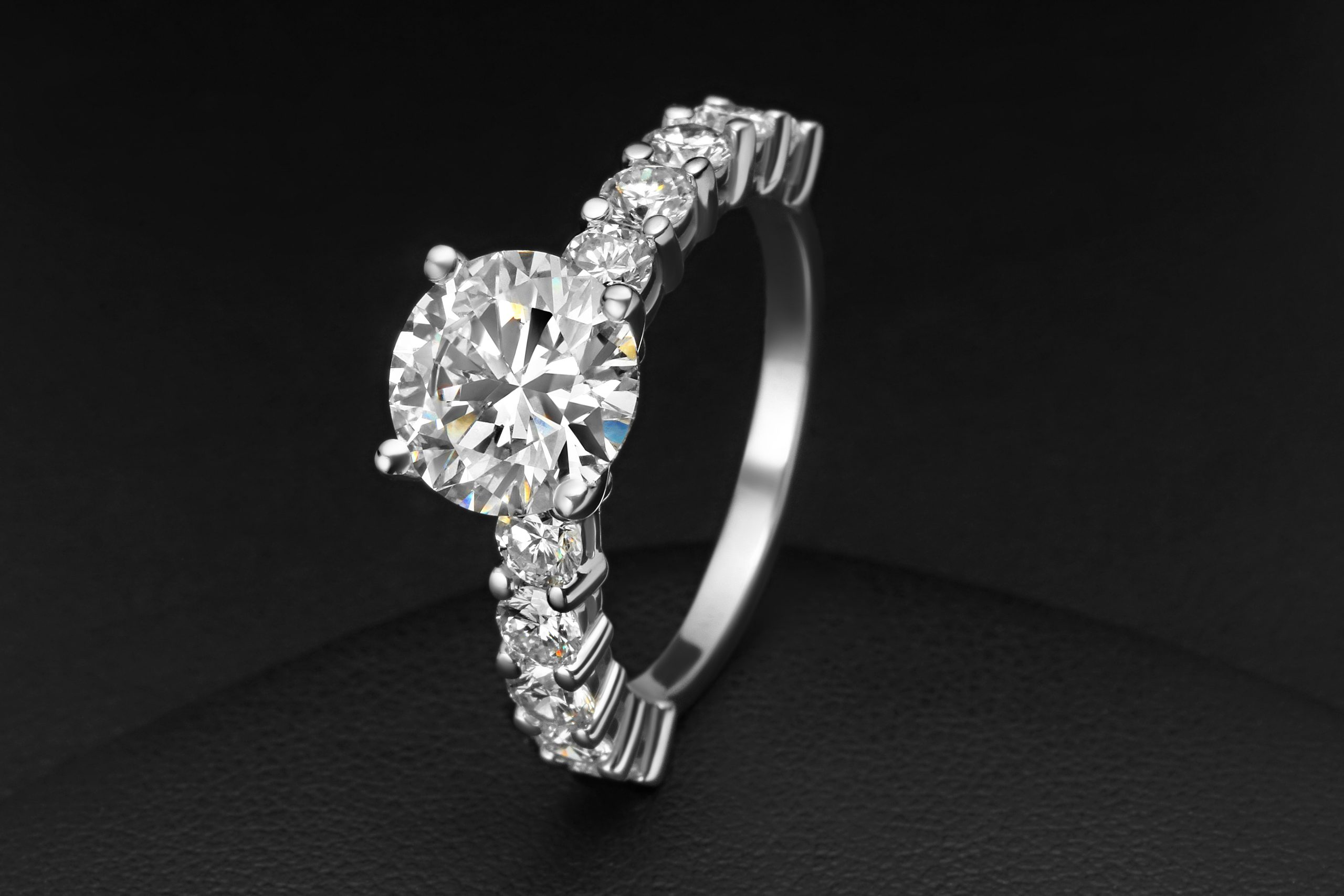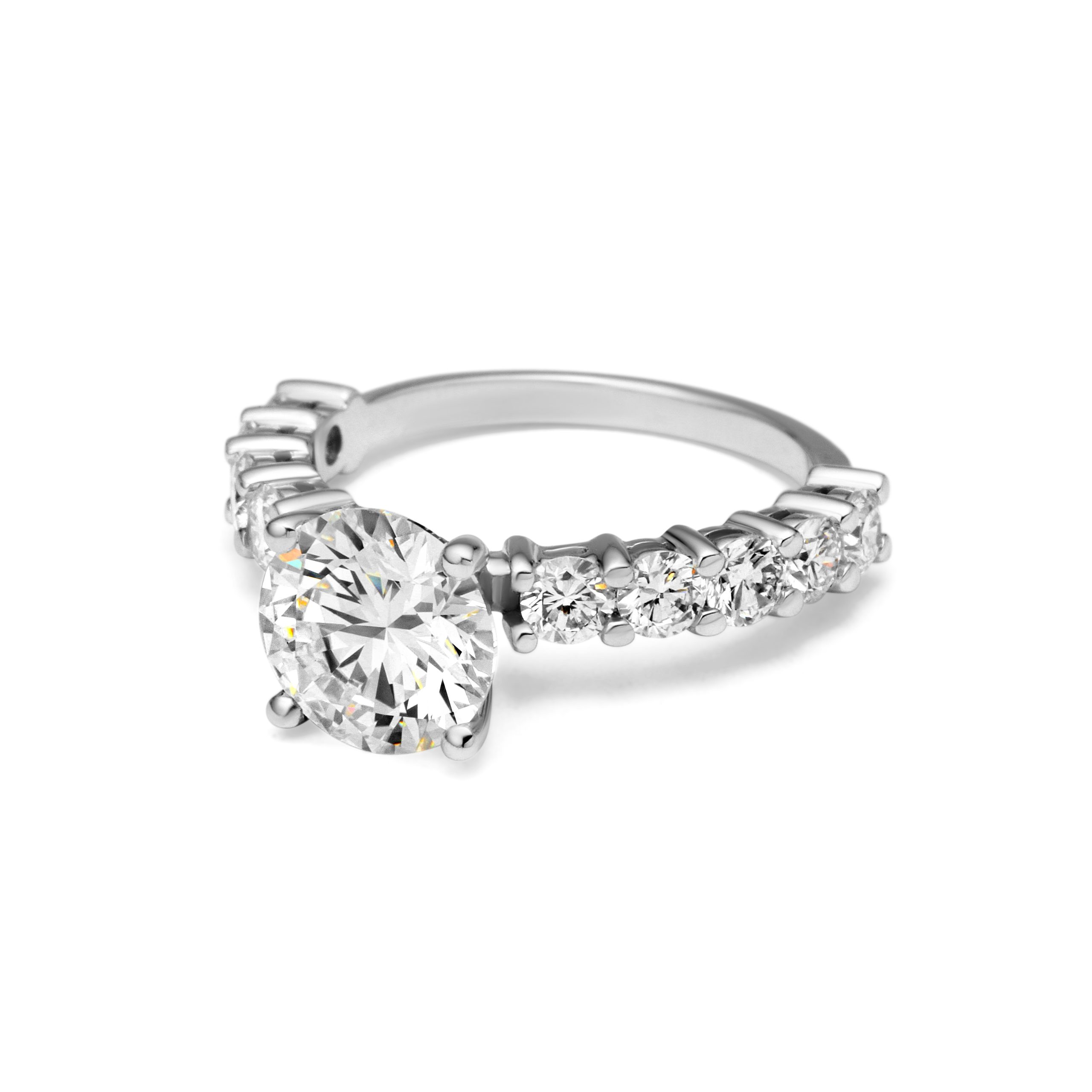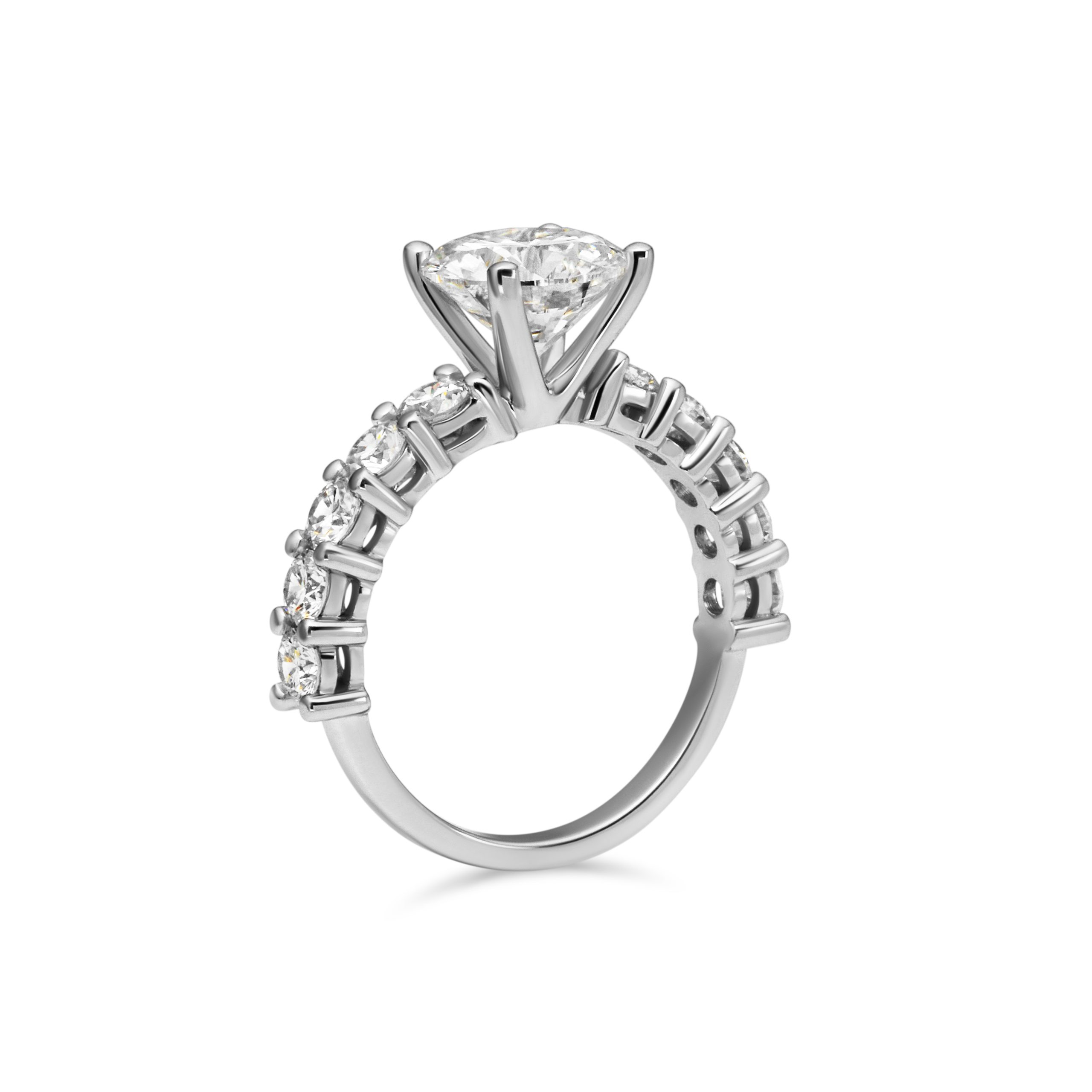 This diamond ring features 1 center stone and 10 side stones. Main diamond is G+ Color and SI+ clarity & side diamonds are D-E color and VVS2-VS clarity, carefully selected for brilliance and consistency.