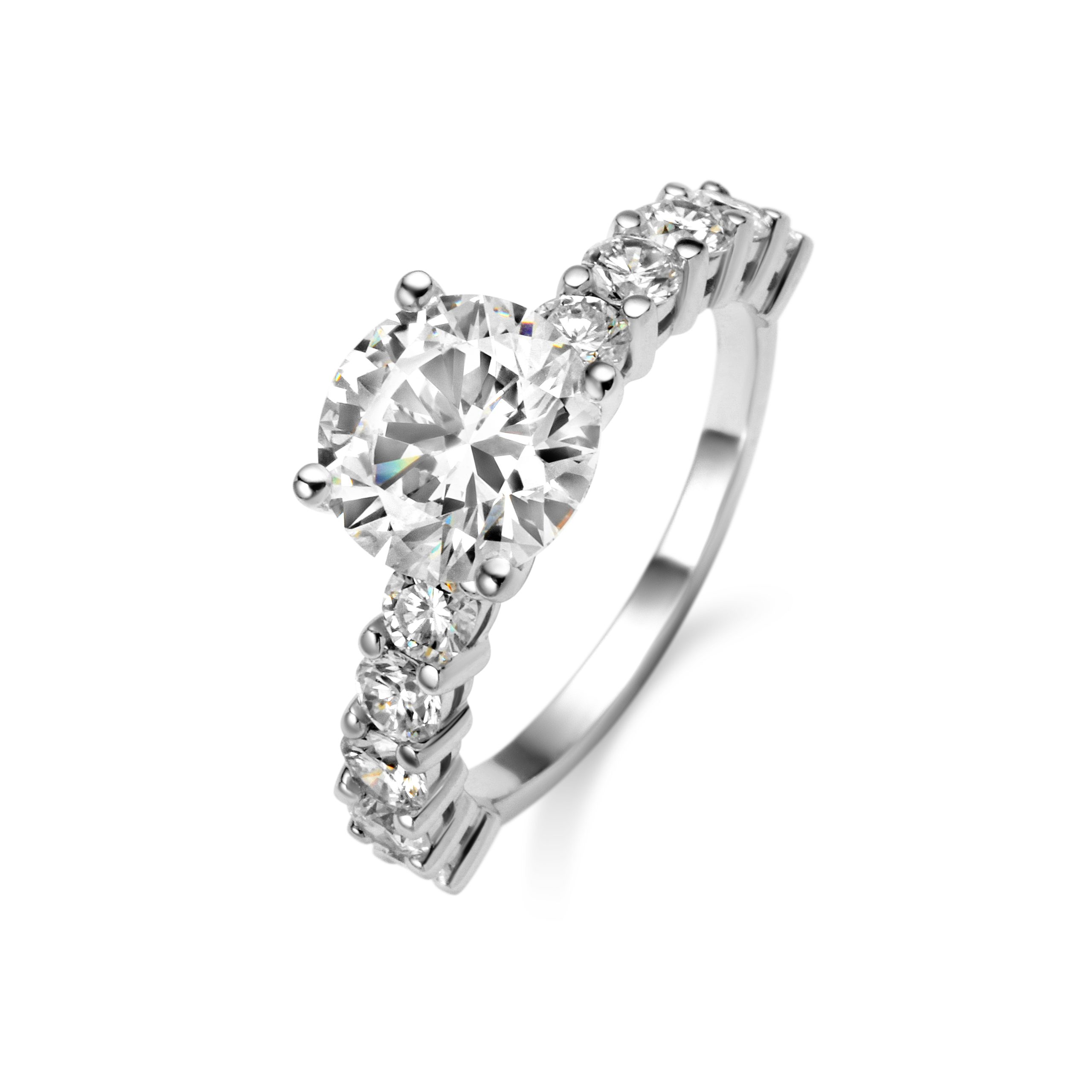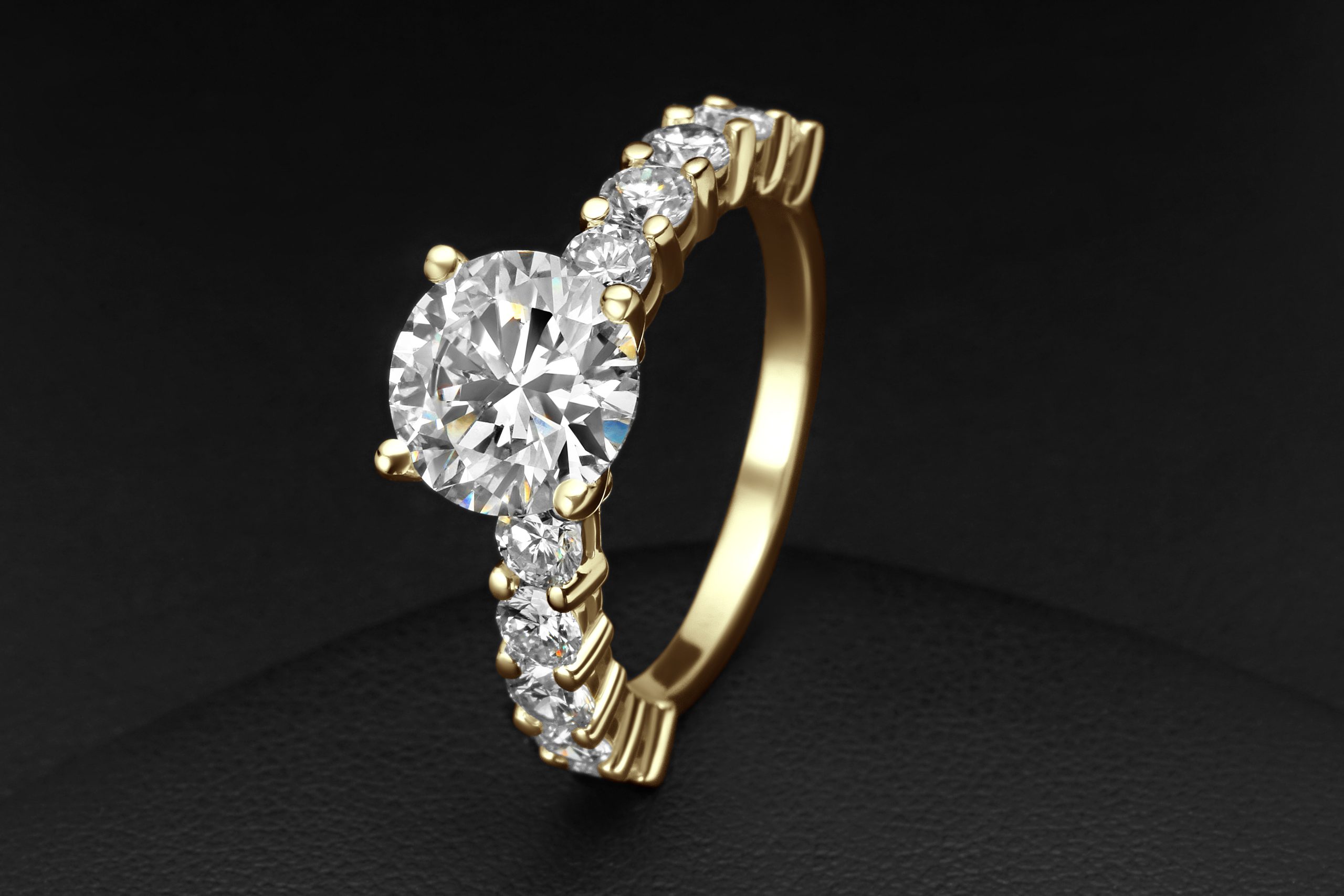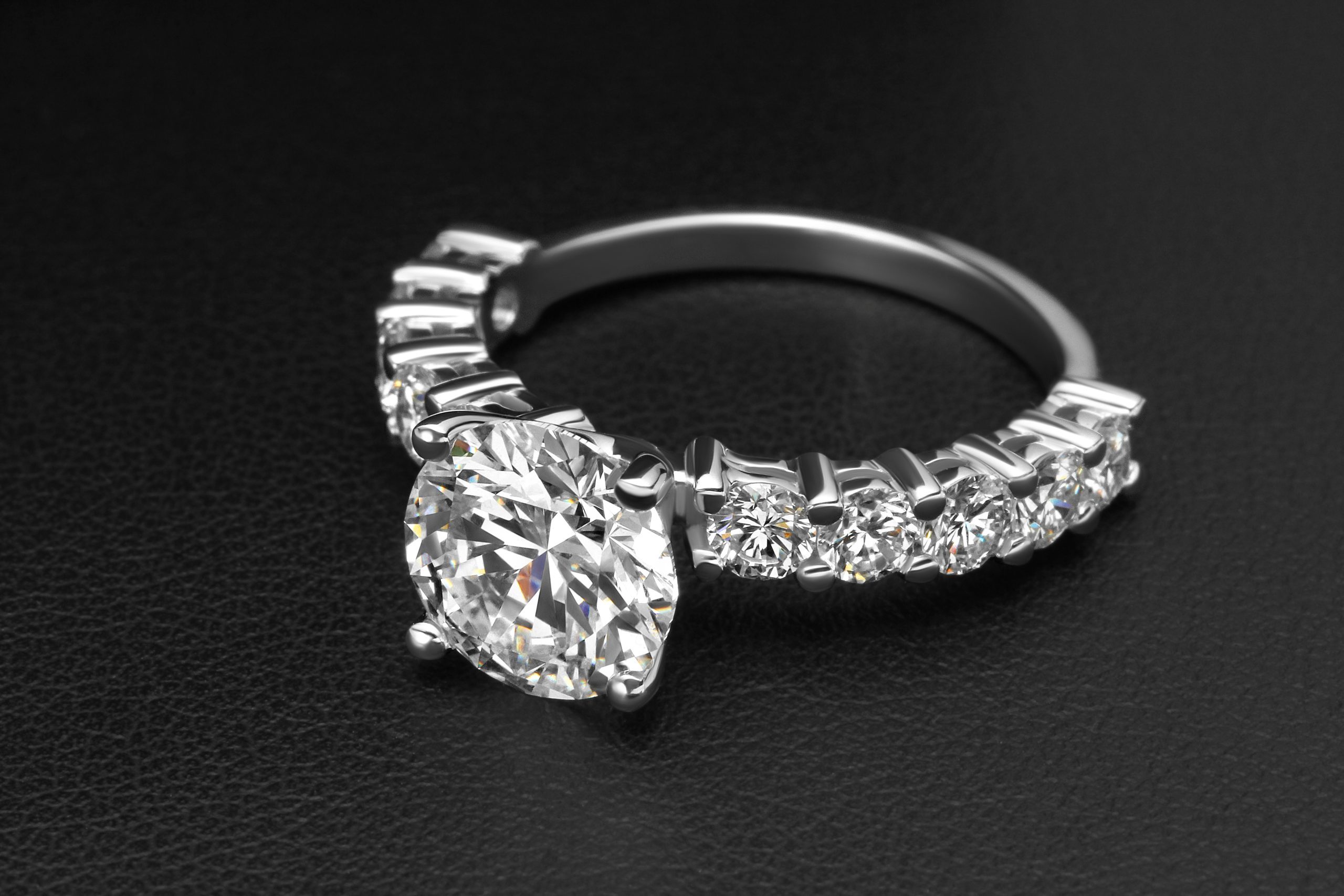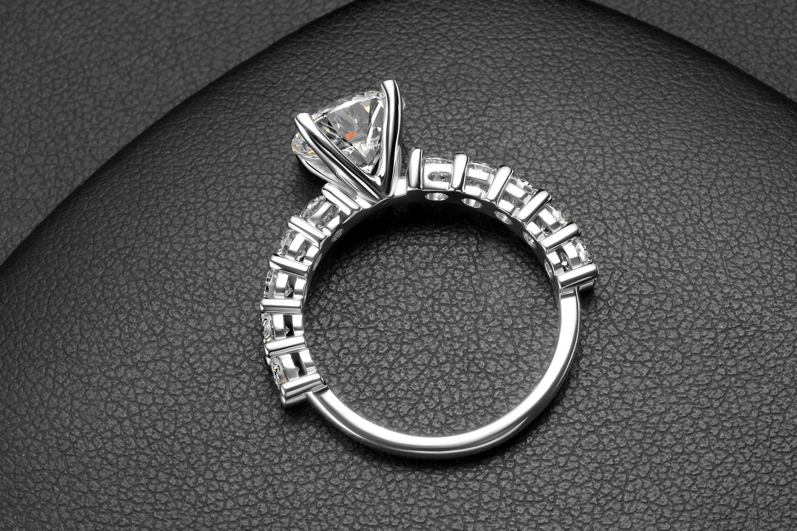 This diamond ring features 1 center stone and 10 side stones. Main diamond is G+ Color and SI+ clarity & side diamonds are D-E color and VVS2-VS clarity, carefully selected for brilliance and consistency.